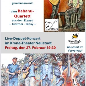 COVERBROTHERS und das BABANU-QUARTETT Doppelkonzert Ein ganz besonderes Konzert wird am 27. Februar im […] 27. Feb. 19:30 - 19:30 Krone Theater KinoHirschenbuckel 2, 79822 Titisee-Neustadt Konzert